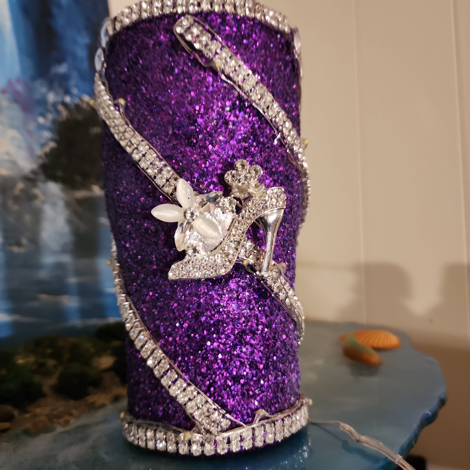 Lighted Hot/Cold tumbler choice of rhinestones, glitter, vinyl for V neckline. Compartment storage for replaceable battery pack